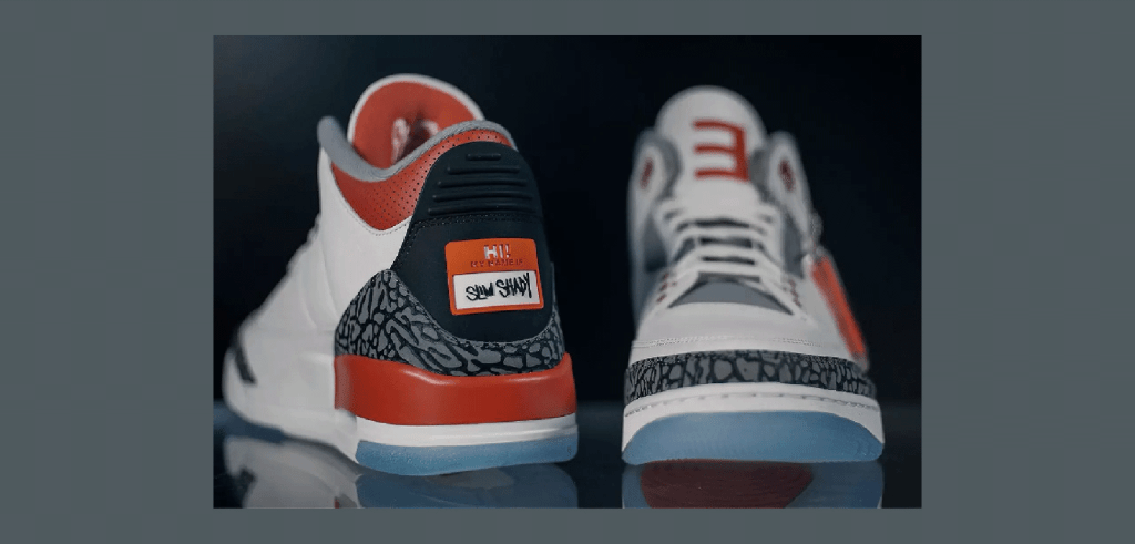 Il riferimento non è assolutamente causale, si tratta del primo grande singolo di successo mondiale di Eminem: The Real Slim Shady. Inoltre sulle scarpe la linguetta di sinistra presenta anche una grande E all’indietro, che ricorda le sue precedenti Air Jordan Carhartt Retro PE.