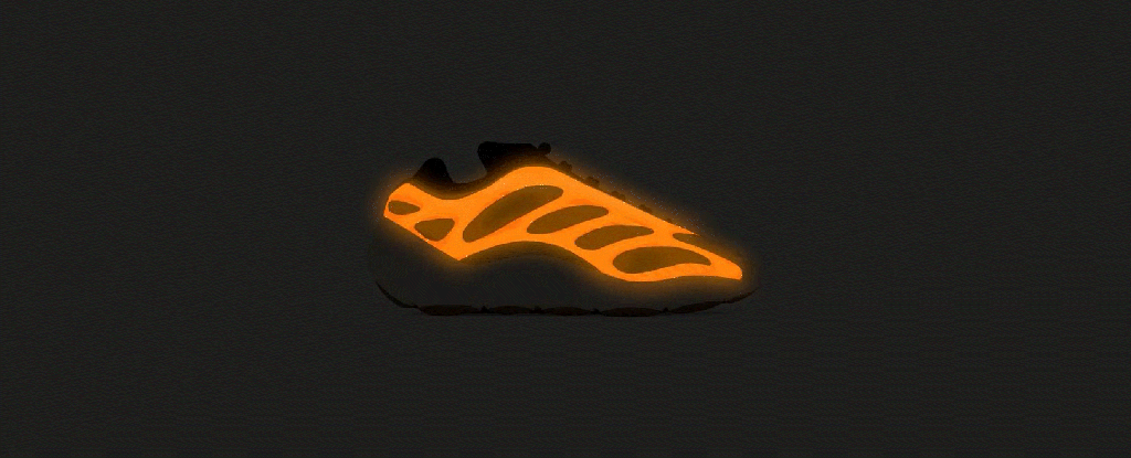 Le gabbie questa volta presentano anche dettagli arancioni luminosi che si illuminano al buio. Ulteriori dettagli si presentano sotto forma di solette, linguette e lacci a contrasto. Completano il design della scarpa l’intersuola in schiuma EVA abbinata a segmenti della suola in gomma.