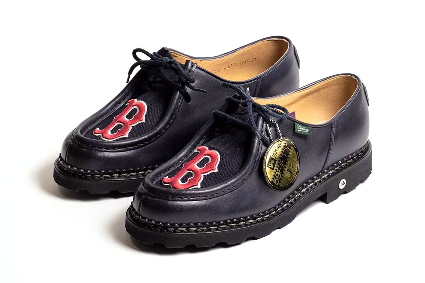 Le scarpe fatte a mano mostrano lo spirito di squadra con colorazioni uniche. Sulla tomaia in pelle i loghi esclusivi sono ricamati a mano sulla punta in pelle scamosciata. Le etichette New Era 59FIFTY sono appese agli occhielli, indicando la misura della scarpa, e le linguette MLB sono applicate sui talloni.