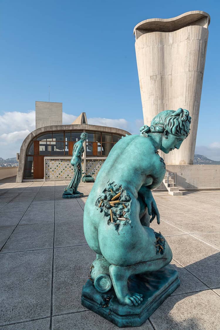 Dirigendosi all’esterno verso la terrazza sul tetto del MAMO, Arsham mette in mostra una serie di sculture in bronzo raffiguranti antichità greche e romane insieme alla sua DeLorean a grandezza naturale erosa dai cristalli.