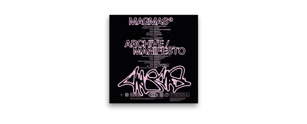 ARCHIVE / MANIFESTO MMXX-MMXXII è la sua prima uscita ufficiale, una compilation di vari artisti con 20 brani inediti. I brani sono stati registrati presso il MAGMAS HQ tra il 2020 e il 2022 e trovano la propria dimensione fisica attraverso una t-shirt, in edizione limitata, disegnata da Beatrice Lattuada & Luca Pirrera, stampata a mano dallo studio serigrafico Legno. La compilation completa sarà accompagnata anche da una bonus track.