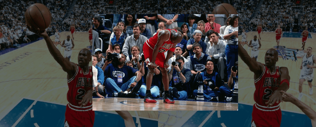 Non ci sono parole per raccontare ciò che ha fatto, riguardando la partita si percepiscono dei momenti in cui è al limite dello svenimento. Leggendario è quell’istante in cui viene sorretto da Scottie Pippen per portarlo quasi in braccio fino alla panchina durante un time-out.